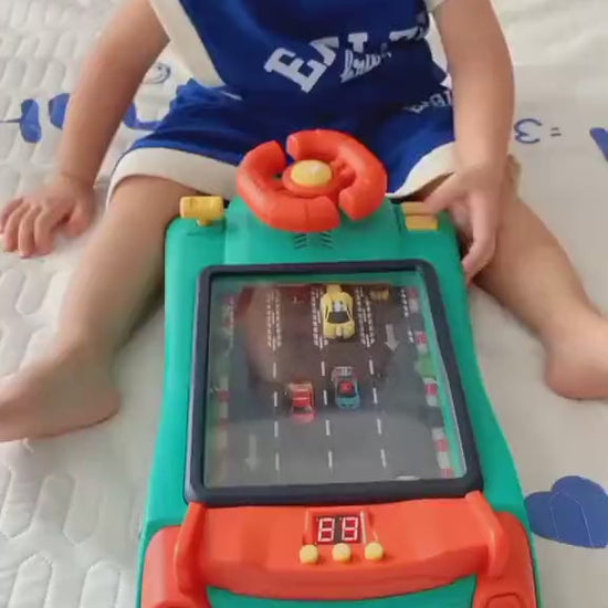 ✔ Simulated driving with real controls – Kids spin the steering wheel to avoid oncoming cars; if they crash, the game resets, teaching focus and timing.